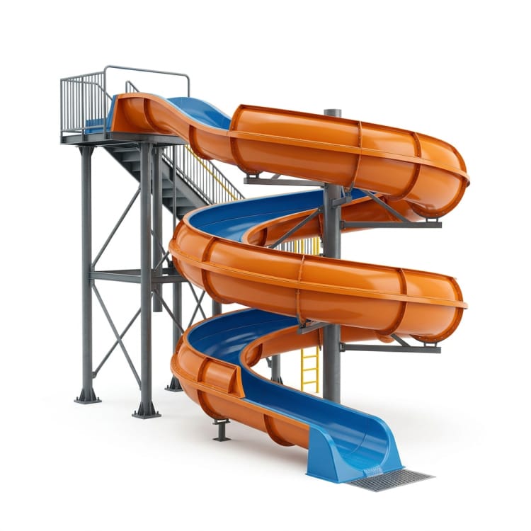 Op maat gemaakte open waterglijbanen met een duurzame constructie van GVK en staal, gladde vormoppervlakken en een projectmatig recreatieontwerp.